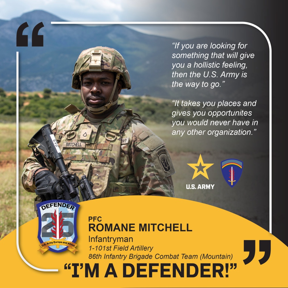 U.S. Army Pfc. Romane Mitchell, a Soldier with the 1-101st Field Artillery, 86th Infantry Brigade Combat Team (Mountain) participates in Immediate Response 25 at Petrochori Army Base, in Xanthi, Greece, May 28th, 2025. Mitchell is currently attached to the 1-102nd Infantry Battalion participating in air assault training alongside Greek soldiers.