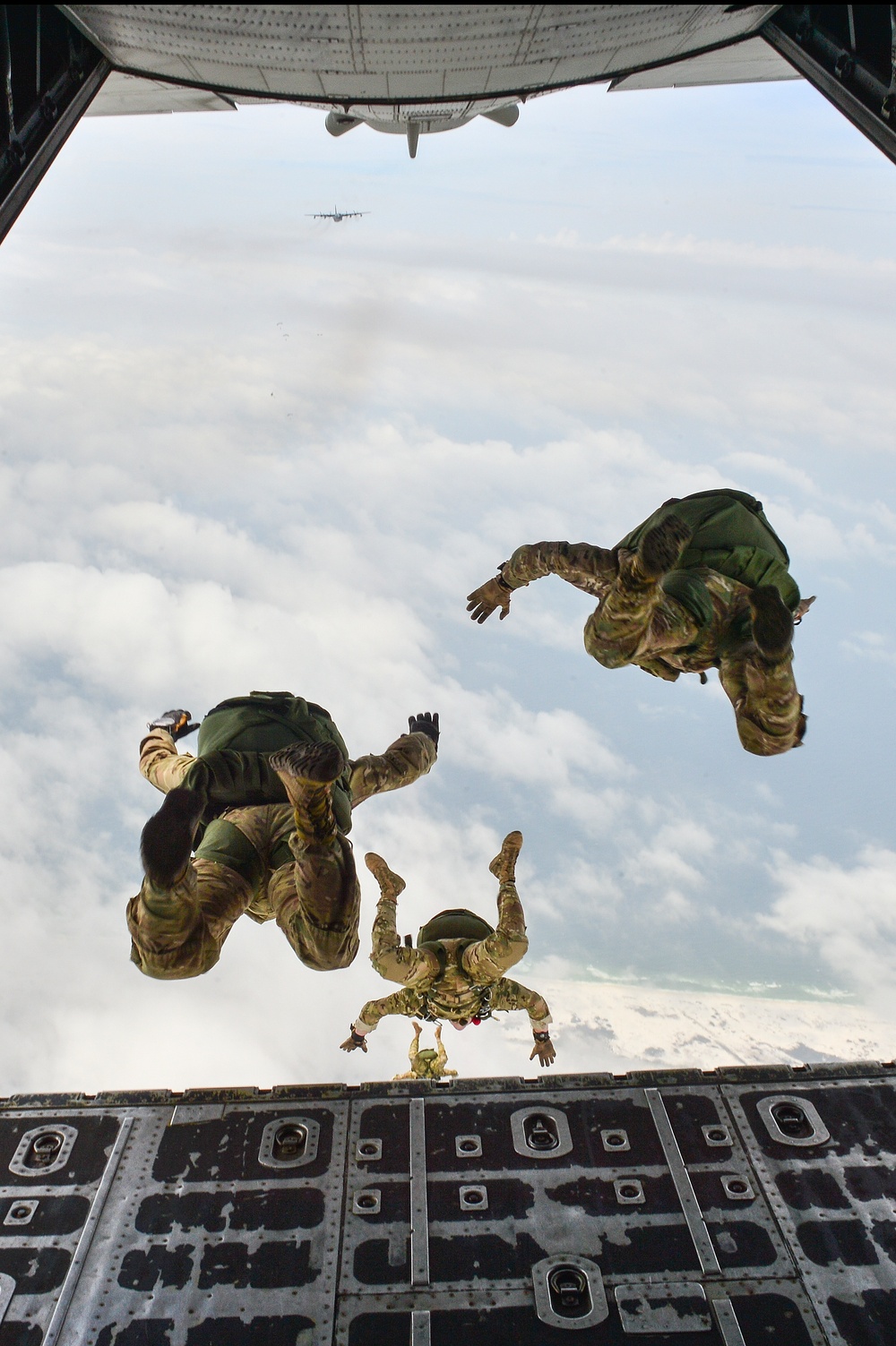 Members of the 7th Special Forces Group perform a High Altitude Low Opening jump from an MC-130P Combat Shadow over Hurlburt Field, Fla., May 15, 2015. The final two MC-130P Combat Shadow aircraft in the Air Force landed for the last time at Hurlburt Field, Fla., in front of more than 400 people and will take their last flight to the boneyard at Davis-Monthan Air Force Base, Ariz., June 1. (U.S. Air Force photo/Senior Airman Jeff Parkinson)