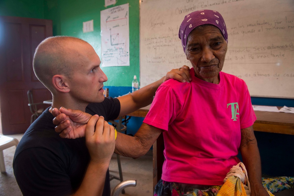 150522-N-NK134-119 CABEZAS, Nicaragua (May 22, 2015) - Lt. Philip Burgess, a native of Gray, Tenn., and physical therapist assigned to Naval Medical Center Portsmouth, Va., teaches a patient physical exercises at a medical site established at the Colegio Moravo Juan Amos Comenius during Continuing Promise 2015. Continuing Promise is a U.S. Southern Command-sponsored and U.S. Naval Forces Southern Command/U.S. 4th Fleet-conducted deployment to conduct civil-military operations including humanitarian-civil assistance, subject matter expert exchanges, medical, dental, veterinary and engineering support and disaster response to partner nations and to show U.S. support and commitment to Central and South America and the Caribbean. (U.S. Navy photo by Mass Communication Specialist 2nd Class Derek Paumen/Released)