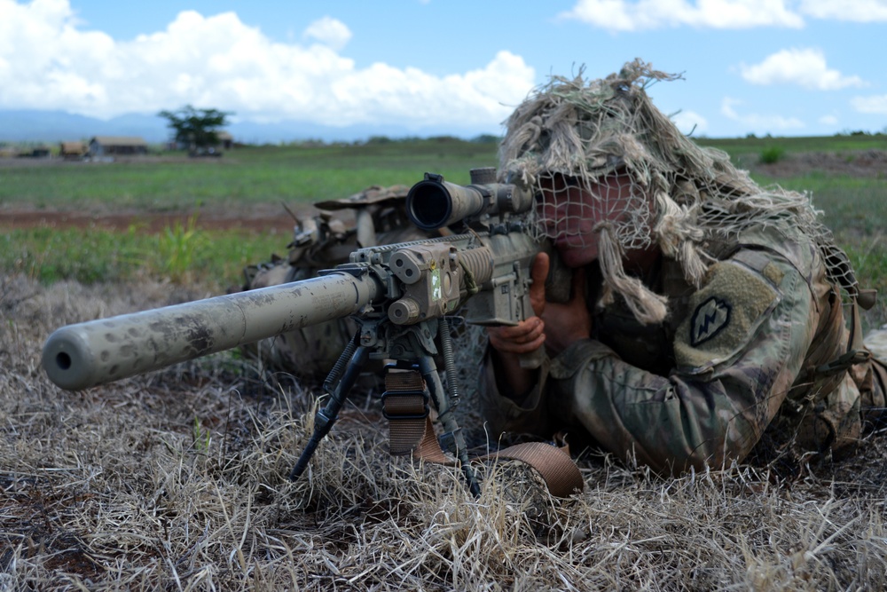 A sniper assigned to the 2nd Battalion, 27th Infantry Regiment, 3rd Brigade Combat Team “Broncos,” 25th Infantry Division, scans the horizon with his sniper rifles prior to the start of a live fire exercise at the Battle Area Complex on Schofield Barracks, Hawaii, Sept. 8, 2017. The live fire exercise was part of Bronco Strike, a two weeklong exercise at various training areas on Oahu. (U.S. Army photo by Staff Sgt. Armando R. Limon, 3rd Brigade Combat Team, 25th Infantry Division)