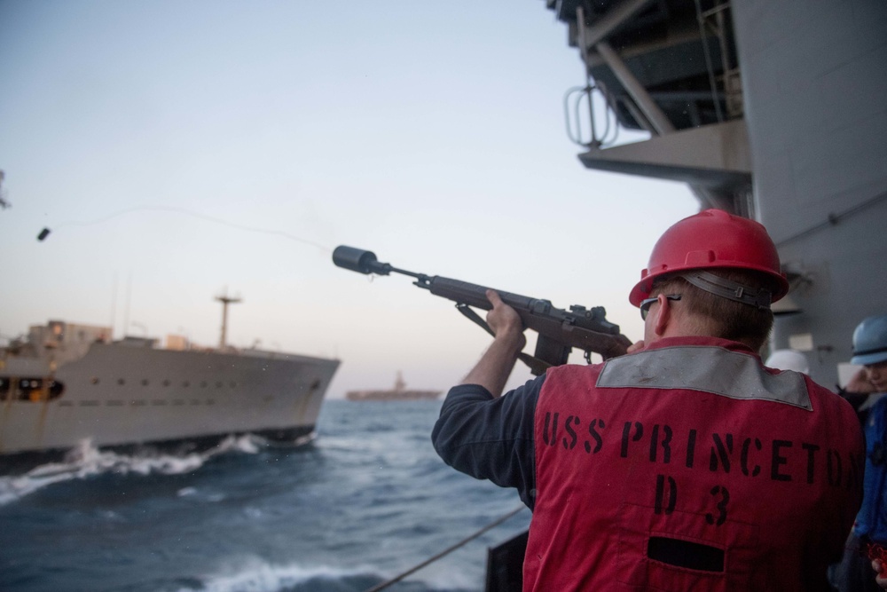 ARABIAN GULF (Oct. 12, 2017) Gunner's Mate 2nd Class Justin Gay, from Guyton, Ga., fires a shot line from the Ticonderoga-class guided-missile cruiser USS Princeton (CG 59) to the fleet replenishment oiler USNS Yukon (T-AO 202) during a replenishment-at-sea. Princeton is deployed in the U.S. 5th Fleet area of operations in support of maritime security operations designed to reassure allies and partners, and preserve the freedom of navigation and the free flow of commerce in the region. (U.S. Navy photo by Mass Communication Specialist 3rd Class Kelsey J. Hockenberger/Released)
