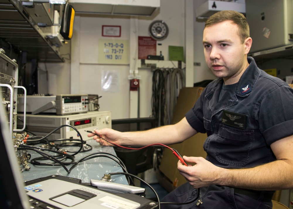 U.S. 5TH FLEET AREA OF OPERATIONS (April 18, 2018) Aviation Electronics Technician 3rd Class Casey Holland calibrates a servo module test set aboard the Wasp-class amphibious assault ship USS Iwo Jima (LHD 7) April 18, 2018. Iwo Jima, homeported in Mayport, Fla., is on a regularly scheduled deployment to the U.S. 5th Fleet area of operations in support of maritime security operations to reassure allies and partners, and preserve the freedom of navigation and the free flow of commerce in the region. (U.S. Navy photo by Mass Communications Specialist Seaman Dominick A. Cremeans/Released)