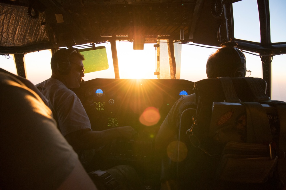 U.S. Air Force pilots with the 746th Expeditionary Airlift Squadron command a C-130H Hercules Nov. 6, 2018, while flying in support of Operation Inherent Resolve. U.S. and Coalition aircraft provide unmatched combat capability in support of U.S. Central Command military objectives. (U.S. Air Force photo/Staff Sgt. Clayton Cupit)