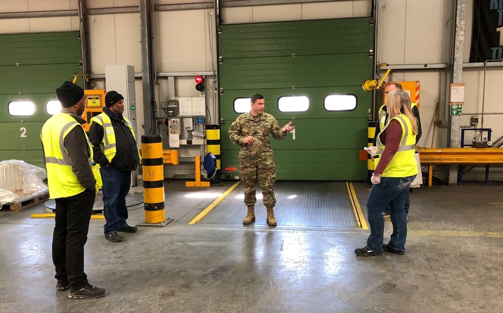 U.S. Army Garrison Rheinland-Pfalz Commander Col. Jason T. Edwards visits a Defense Commissary Agency (DeCA) warehouse and speaks with DeCA representatives April 1 at Germersheim Army Depot. (U.S. Army photo by Leonard Chanler)