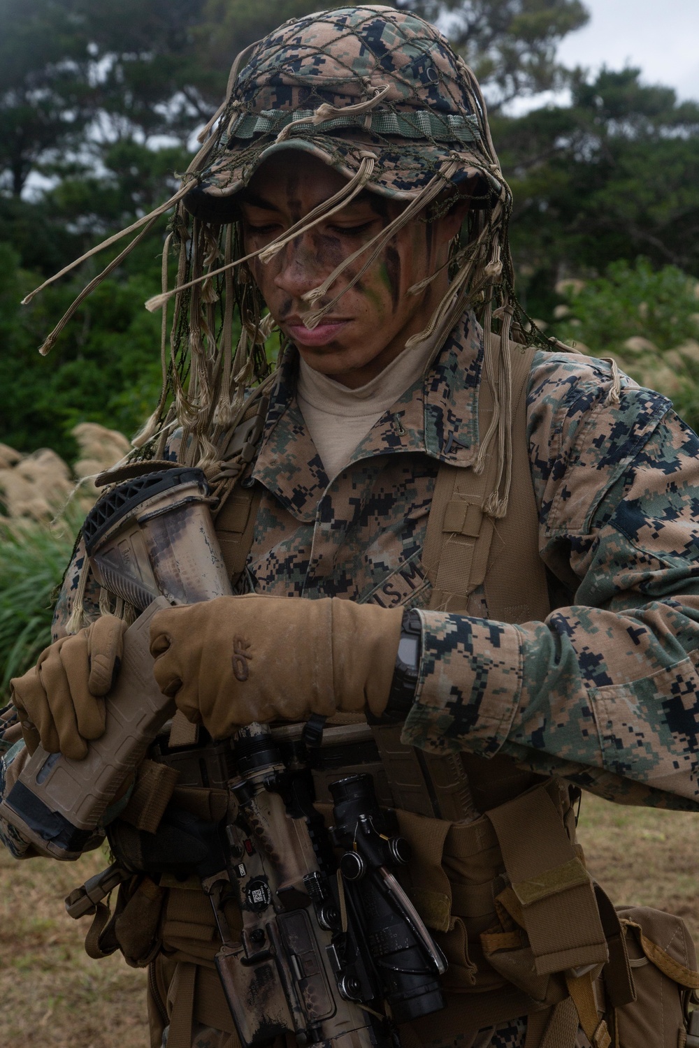 Lance Cpl. Hopeland West, a rifleman with Kilo Company, 3d Battalion, 8th Marines, currently attached to 3d Marine Division as a part of the unit deployment program, loads a magazine during a force on force exercise at Camp Gonsalves, Okinawa, Japan on Oct. 15, 2020. The Marines demonstrated their ability to utilize command and control nodes in order to conduct simultaneous assaults in a distributed setting across the Indo-Pacific region. West is a native of Cheshire, Connecticut (U.S. Marine Corps photo by Lance Cpl. Kolby Leger)