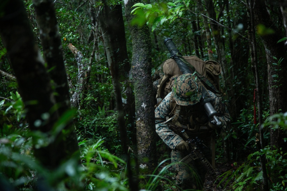 A U.S. Marine with Kilo Company, 3d Battalion, 8th Marines, currently attached to 3d Marine Division as a part of the unit deployment program, patrols during a force on force exercise at Camp Gonsalves, Okinawa, Japan on Oct. 16, 2020. The Marines demonstrated their ability to utilize command and control nodes in order to conduct simultaneous assaults in a distributed setting across the Indo-Pacific region (U.S. Marine Corps photo by Lance Cpl. Kolby Leger)