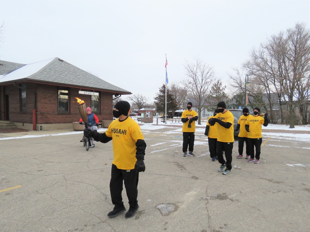 Members of the Fort McCoy, Wis., Army Ten-Miler team carry an event torch Jan. 29, 2021, as part of the opening ceremony of the Sparta Quest Winter Fest in Sparta, Wis. On Jan. 29, members of the team, along with Command Sgt. Maj. Paul Mantha, Fort McCoy Garrison command sergeant major, carried the ceremonial torch for the event for 2 miles from the Sparta Chamber of Commerce building through downtown Sparta to Memorial Park where a group of city residents awaited. A Ten-Miler team member then passed the torch off to Sparta Mayor Kristen Gust who proceeded to light the bonfire to commence the weekend-long event. (U.S. Army Photo by Kaleen Holliday, Public Affairs Office, Fort McCoy, Wis.)