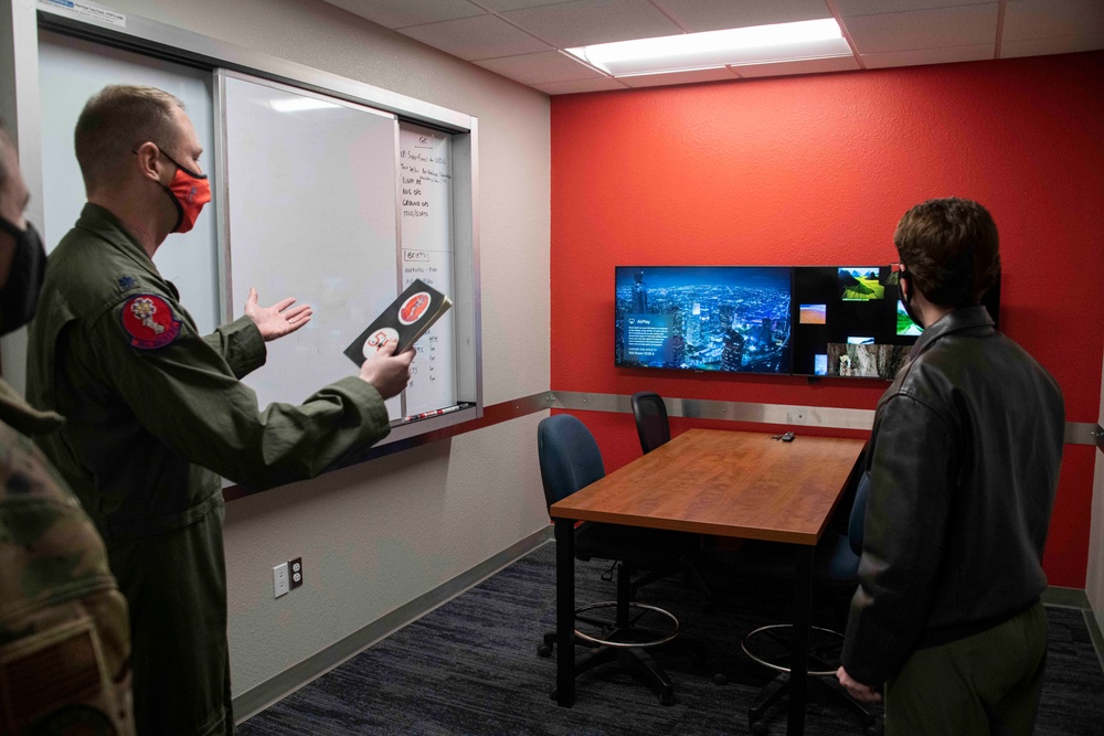 Lt. Col. Michael Rasinski, 58th Airlift Squadron commander, showcases one of the squadron’s briefing rooms to Gen. Jacqueline Van Ovost, Air Mobility Command (AMC) commander, Feb. 8, 2021, at Altus Air Force Base, Oklahoma. During the AMC command team’s visit, they were able to see the three flying squadrons assigned to the 97th Air Mobility Wing. (U.S. Air Force photo by Staff Sgt. Cody Dowell)