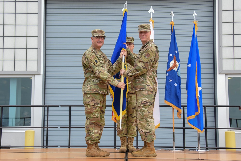 Maj. Gen. Peter Nezamis, Assistant Adjutant General - Air, State of Illinois, left, passes the 183d Wing flag to 183d Commander Col. Robert Gellner, right, in an Assumption of Command July 29, 2021, at the 183d Wing, Springfield, Illinois. Gellner is the twelfth Commander of the 183d Wing. (Air National Guard photo by Airman Katherine M. Jacobus).