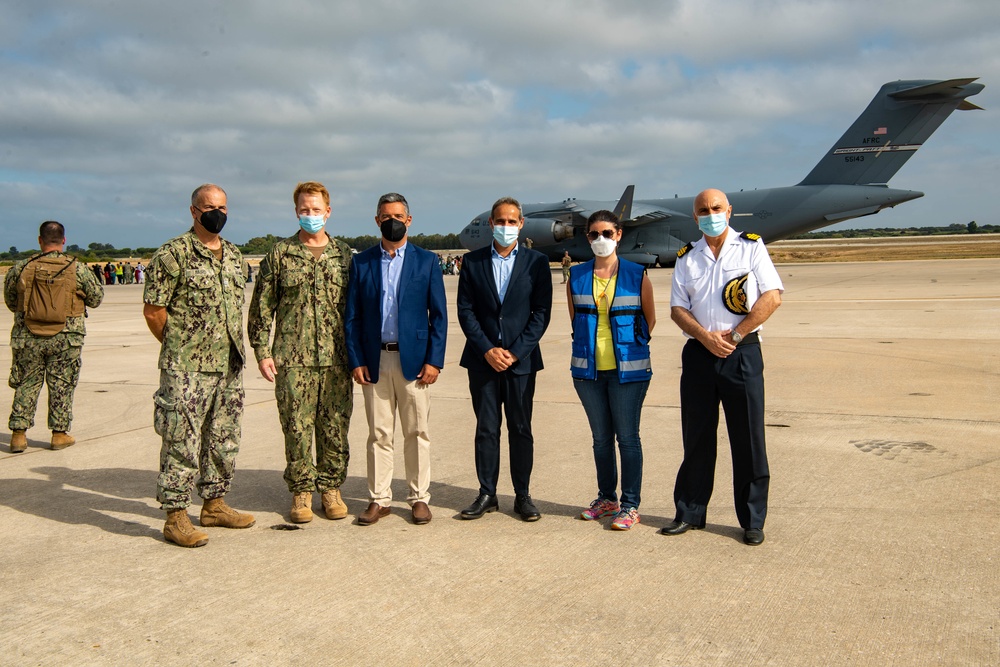 NAVAL STATION ROTA, Spain (Aug. 27, 2021) (From left) Capt. David Baird, commanding officer Naval Station (NAVSTA) Rota, Spain, Rear Adm. Benjamin Reynolds, director of maritime headquarters, U.S. Naval Forces Europe-Africa/U.S. 6th Fleet, Javier Ruiz Arana, Mayor of Rota, Spain, Jose Antonio Pacheco Calvo, underdelegate of the Government of Cadiz, Leana Lopez, U.S. Embassy political advisor, and Vice Adm. Ricardo A. Hernandez Lopez, Admiral of logistic support, pose for a photo during the arrival of evacuees from Afghanistan at Naval Station (NAVSTA) Rota Aug. 27, 2021. NAVSTA Rota is currently supporting the Department of State mission to facilitate the safe departure and relocation of U.S. citizens, Special Immigration Visa recipients, and vulnerable populations from Afghanistan. (U.S. Navy photo by Mass Communication Specialist 2nd Class John Owen)