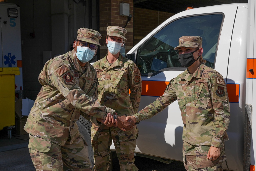 Maj. Gen. Randall Reed, Third Air Force commander, presents Airman 1st Class Taylor Vega, 48th Medical Group, with a coin acknowledging her outstanding performance within her unit Sept. 8, 2021, at Royal Air Force Lakenheath, England. Within the U.S. Air Force there’s a long standing tradition of giving coins as a way to acknowledge high performing Airmen among other things. (U.S. Air Force photo by Senior Airman John Ennis)