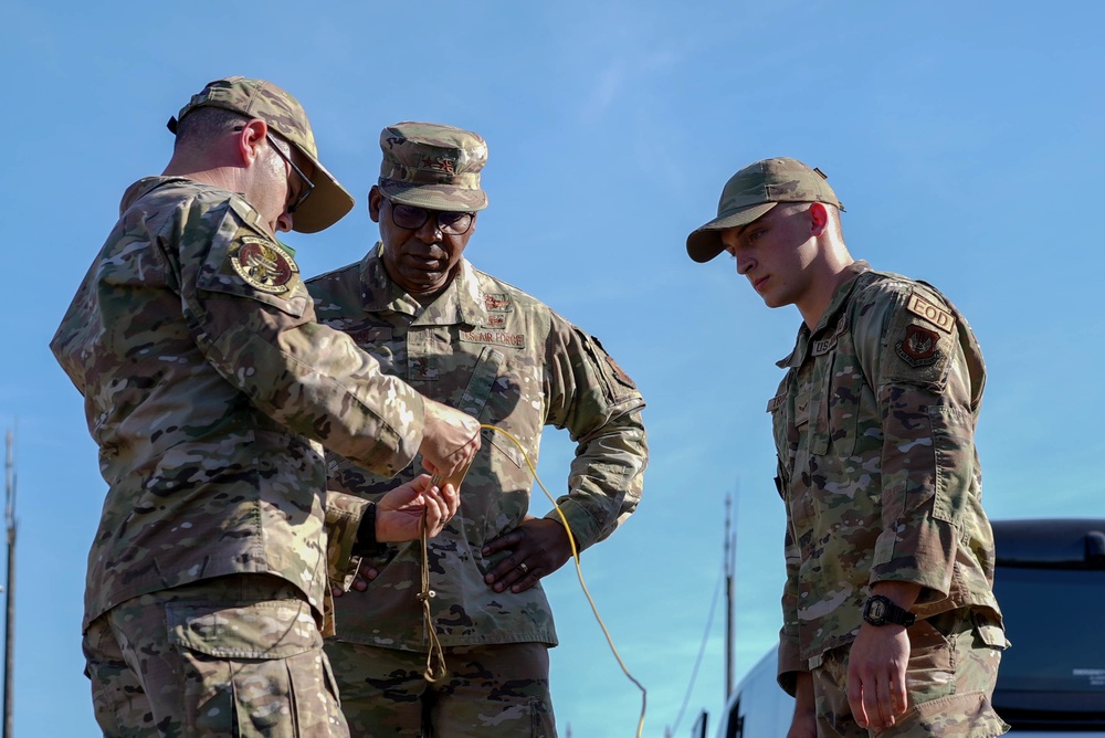 Airmen from the 48th Civil Engineer Squadron's Explosive Ordnance Disposal flight instruct Maj. Gen. Randall Reed, Third Air Force commander, on how to use a specific device prior to a demonstration of one of EOD’s many innovations Sept. 8, 2021, at Royal Air Force Lakenheath, England. EOD remains at the forefront of Air Force innovation which has led to the development and implementation of several disposal technologies such as the one being demonstrated. (U.S. Air Force photo by Senior Airman John Ennis)