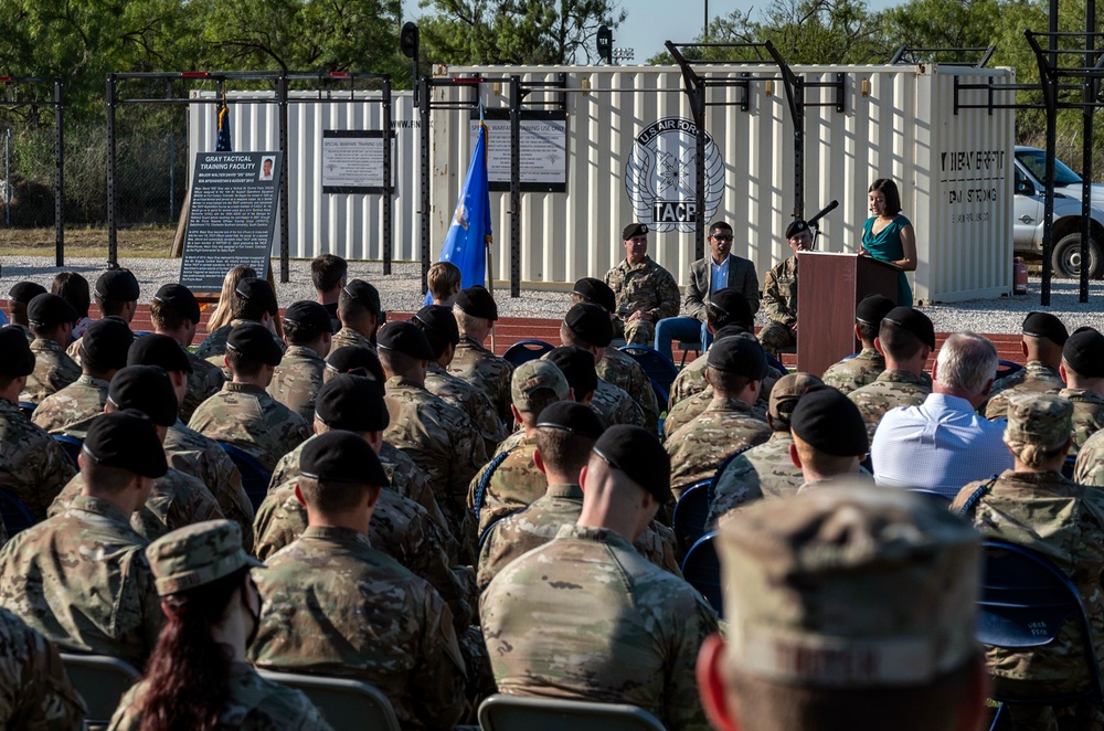 Nyah Gray, daughter of Heather Gray Blalock and Maj. Walter David Gray, addresses the crowd during the Major David Gray Tactical Training Facility dedication ceremony Oct. 8, 2021, at the JBSA-Chapman Training Annex. The training facility was named the Gray Tactical Training Facility in honor of the service, heroism and ultimate sacrifice of Major David Gray. He was killed in action outside of combat outpost Fiaz and was posthumously awarded the Bronze Star Medal with Valor and a Purple Heart.