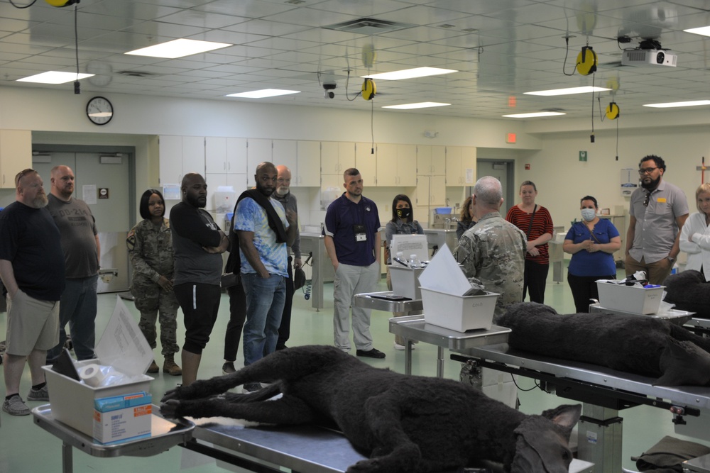 On, March 30, 2022, day two of two half-day sessions at the U.S. Army Medical Center of Excellence (MEDCoE), Joint Base San Antonio, Texas, 35 educators and six recruiters from the Chicago, Illinois area toured the veterinary lab at the MEDCoE Department of Veterinary Science and received an overview about the canine simulators, animal care technicians and food inspection as part of a larger visit sponsored by the Chicago Recruiting Battalion, to JBSA-Fort Sam Houston, March 29-30, 2022. They also visited the Departments of Dental Science and Preventive Health Services, received a command brief and participated in a question-and-answer session with the MEDCoE Commanding General, Maj. Gen. Dennis LeMaster.