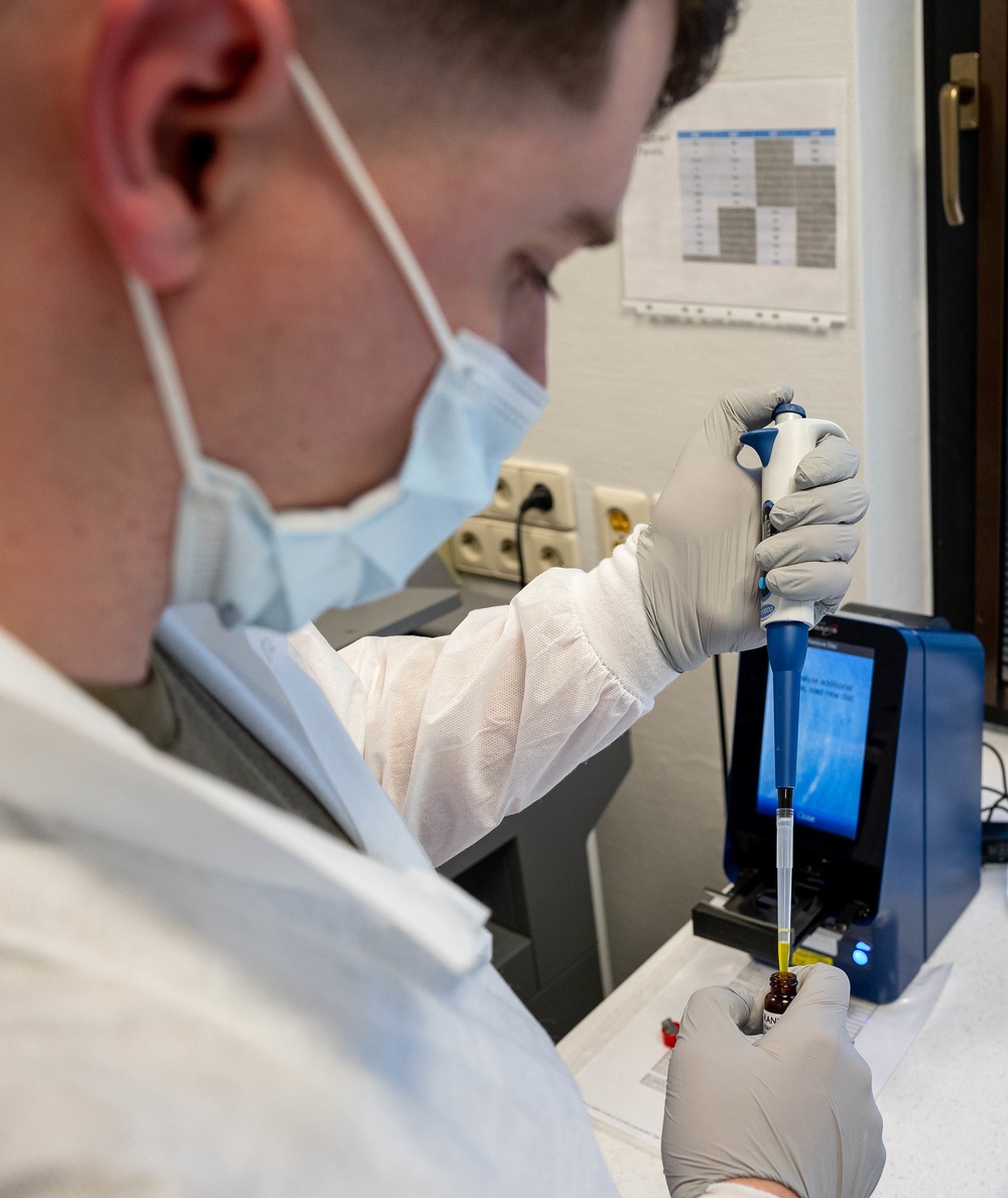 U.S. Air Force Senior Airman Dakota Moss, 86th Medical Support Squadron laboratory technician, prepares laboratory samples at Ramstein Air Base, Germany, March 24, 2022. While working from Lajes Field, Portugal, he coordinated travel for biomedical equipment repair technicians, allowing for the calibration of medical equipment. Additionally, Moss delivered 20 vaccinations and collected samples of 98% of overdue personnel ensuring mission readiness. (U.S. Air Force photo by Senior Airman Thomas Karol)