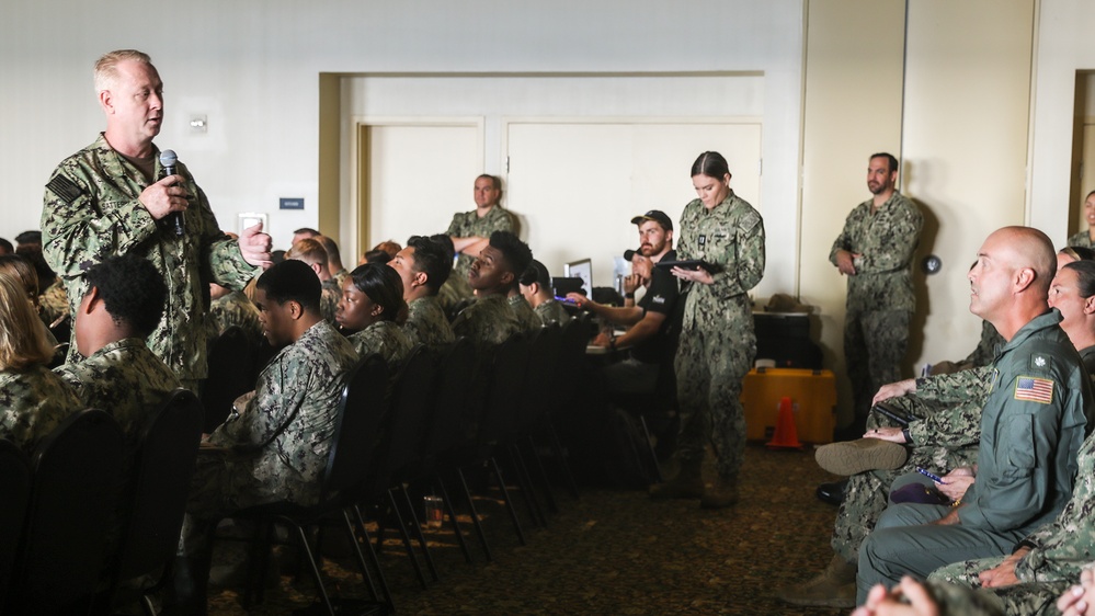 Rear Adm. Stuart Satterwhite, commander, MyNavy Career Center, responds to questions from Sailors during a town hall event kicking off Career Development Symposium Mid-Atlantic. The symposium, hosted by Navy Personnel Command, is visiting Naval Base Norfolk to reach out to Sailors and inform them of the benefits available from the personnel modernization initiatives of the Sailor 2025 program. (U.S. Navy photo by Mass Communication Specialist Seaman Moises Sandoval/Released)