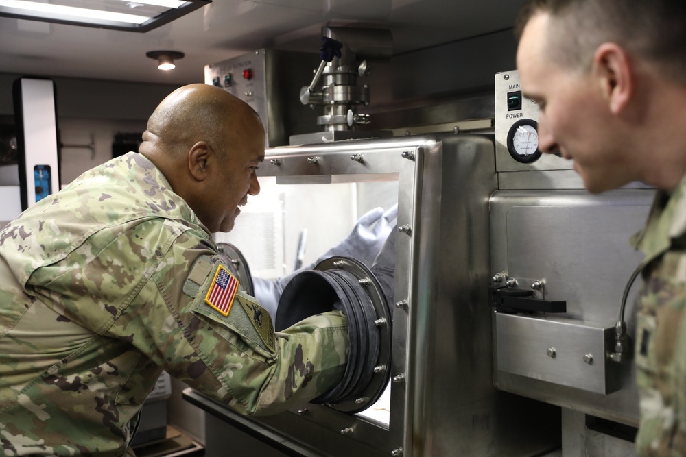 U.S. Army Gen. Darryl Williams, Commanding General U.S. Army Europe and Africa (USAEUR-AF,) takes samples of notional unidentified agents during a capabilities briefing of the 773rd Civil Support Team's (CST,) analytical laboratory during a key-leader engagement at Rhine Ordnance Barracks, Germany, August 10.