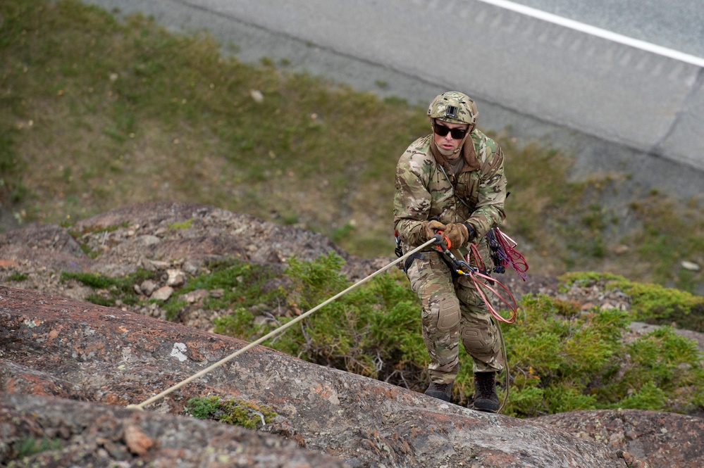 U.S. Air Force Capt. Travis Hunt, a tactical air control party specialist and commanding officer of Detachment 1, 3rd Air Support Operations Squadron, Joint Base Elmendorf-Richardson, ascends a rock face during mountaineering training at Sunshine Ridge, Alaska, Aug. 25, 2022. The 3rd ASOS special warfare Airmen utilize Alaska’s varied and austere training locations to prepare for conditions they may face on deployment. (U.S. Air Force photo by Alejandro Peña)