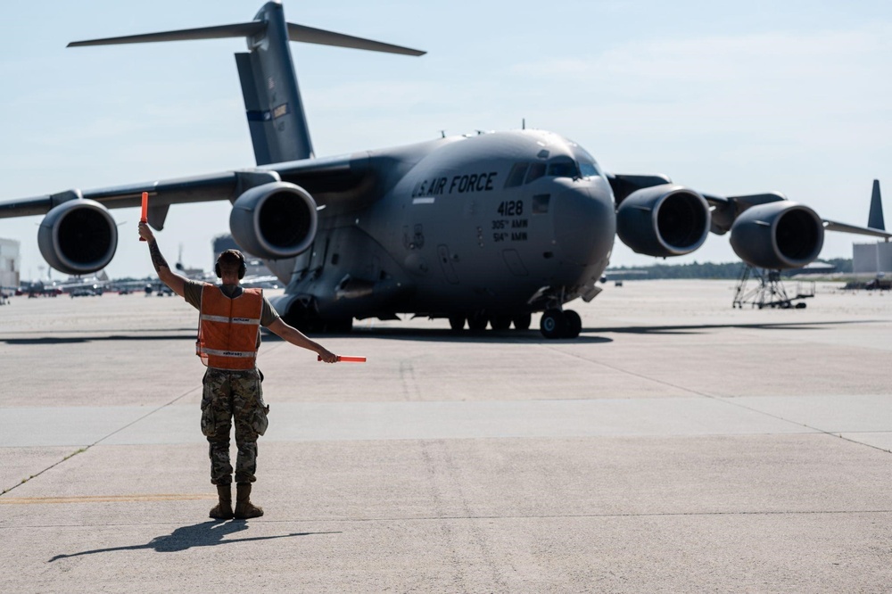An Airman assigned to the 305th Aircraft Maintenance Squadron marshals a C-17 Globemaster at Joint Base McGuire-Dix-Lakehurst, New Jersey, Aug. 24, 2022. This aircraft from the 305th Air Mobility Wing, and its associate reserve unit the 514th Air Mobility Wing, based at JBMDL, practiced flying a resupply mission with a low-level ingress into a simulated hostile location while responding to surface-to-air missiles fired by an enemy at Fort Indiantown Gap, Pennsylvania. (U.S. Air Force photo by Senior Airman Joseph Morales, Joint Base McGuire-Dix-Lakehurst Public Affairs)
