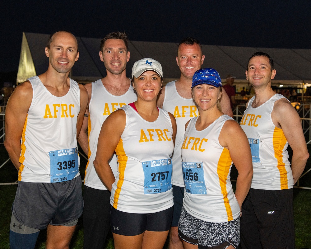 The Air Force Reserve Command Fly! Fight! Win! Challenge team prior to the start of the 2022 Air Force Marathon races at Wright-Patterson Air force Base, Ohio, Sept. 17, 2022. Twelve teams representing major commands competed for the overall title. (U.S. Air Force photo by R.J. Oriez)