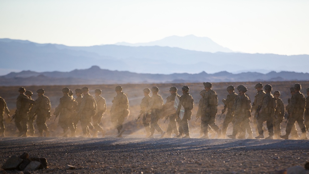U.S. Marines from the Infantry Officer Course conduct a company attack with support by fire during PALMFEX in Twentynine Palms, California, Feb. 17, 2022. PALMFEX is a two-week exercise where officers in the Infantry Officer Course participate in a combat readiness evaluation. (U.S. Marine Corps photo by Cpl. Caden Phillips)