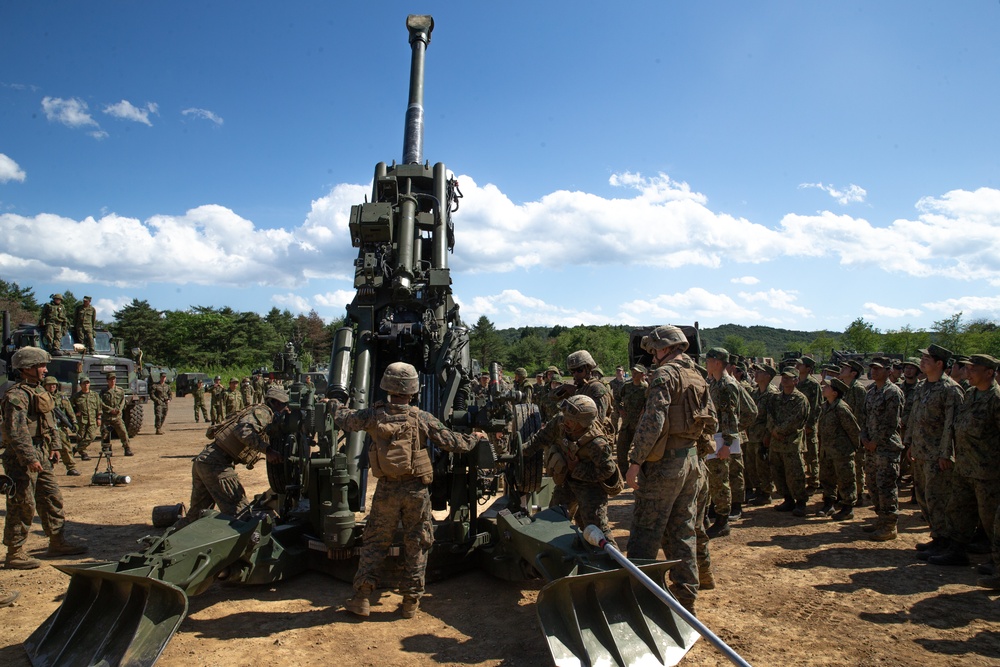 U.S. Marines display an M777 Howitzer to Japan Ground Self Defense Force soldiers with North Eastern Army Artillery Regiment after the completion of Artillery Relocation Training Program 23.1 at Ojojihara Maneuver Area, Miyagi, Japan, June 5, 2023. ARTP provides Marines the opportunity to rehearse live-fire operations across a range of climates and conditions, providing combat ready forces in the Indo-Pacific. The Marines are currently deployed with 3d Battalion, 12th Marines, 3d Marine Division. (U.S. Marine Corps photo by Cpl. Michael Taggart)