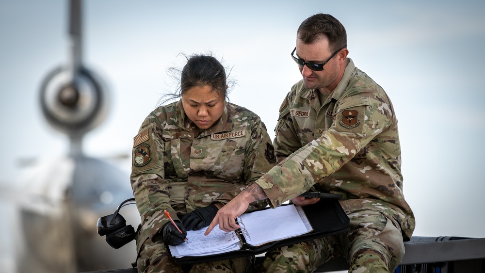 U.S. Air Force Staff Sgt. Dung Ho, left, 749th Air Mobility Maintenance Squadron crew chief, receives on the job training from Staff Sgt. Jacob St. George, KC-10 Extender Airframe, Powerplant General (APG) instructor, during a nose landing gear tire change at Travis Air Force Base, California, June 15, 2023. St. George is one of the last 11 KC-10 Field Training Instruction Class instructors at Travis AFB as the base and the Air Force transitions to the newer KC-46 Pegasus. (U.S. Air Force photo by Tech. Sgt. Philip Bryant)
