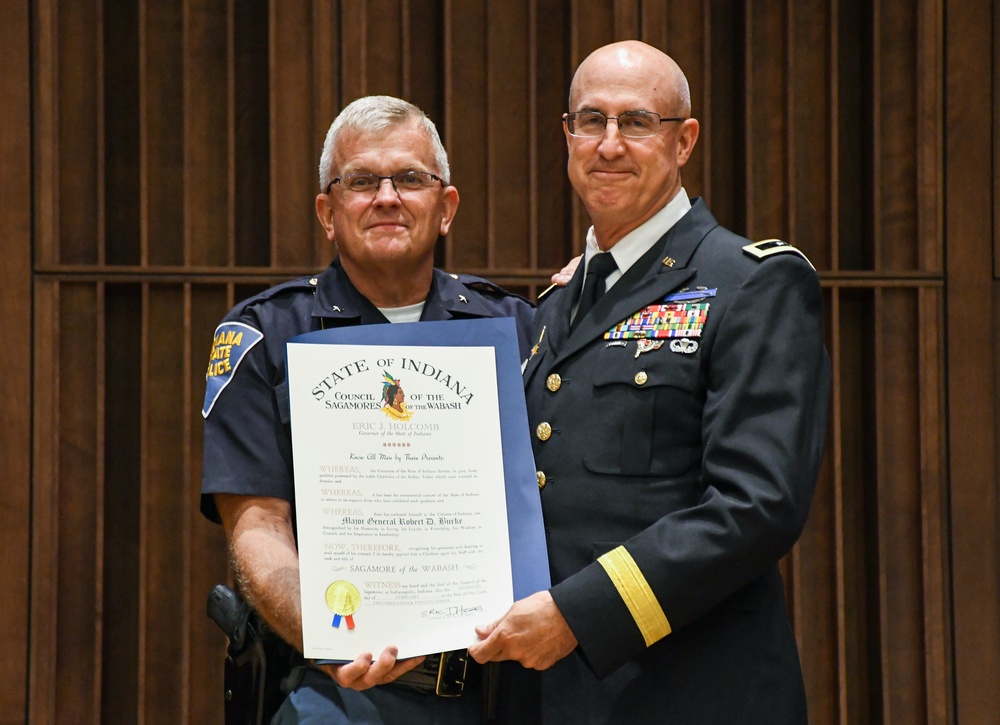 Doug Carter, Indiana State Police superintendent, presents Maj. Gen. Robert Burke with the Sagamore of the Wabash award during his retirement ceremony at Indiana National Guard Headquarters in Indianapolis, June 22, 2023. The Sagamore of the Wabash is the highest honor an Indiana governor can bestow and is presented to distinguished Hoosiers who have made significant contributions to the state. (Indiana National Guard photo by Sgt. Kelsea Cook)