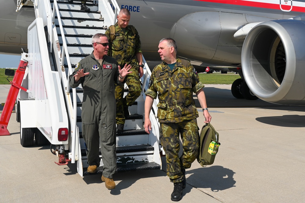 Col. John Williams, 155th Air Refueling Wing commander, greets members of the Czech Armed Forces and senior leadership, Aug. 22, 2023, at the National Guard air base in Lincoln, Nebraska, as they arrive ahead of the Guardians of Freedom Airshow. The Nebraska National Guard celebrates 30 years of partnership with the Czech Republic this year through the Department of Defense’s State Partnership Program. Through SPP, the National Guard conducts military-to-military engagements in support of defense security goals but also leverages whole-of-society relationships and capabilities to facilitate broader interagency and corollary engagements spanning military, government, economic and social spheres. (U.S. Air National Guard photo by Senior Airman Alexander D. Schriner