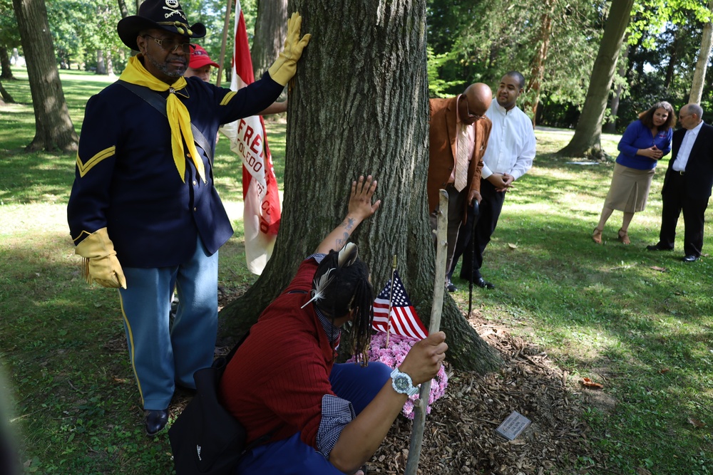 Members of the Fremont, Ohio chapter of the NAACP along with Earl Mack, US Posts commander of the Buffalo Soldiers Motorcycle Club and charities, place a hand on a tree dedicated to U.S. Colored Troops of the Civil War from Sandusky County, Ohio at Spiegel Grove in Fremont, Ohio Oct. 1, 2023. Tree dedications at the historical home of the former president are a tradition that began with Hayes himself. (U.S. Army Reserve Photo by Staff Sgt Bob Yarbrough, 88th RD Public Affairs)