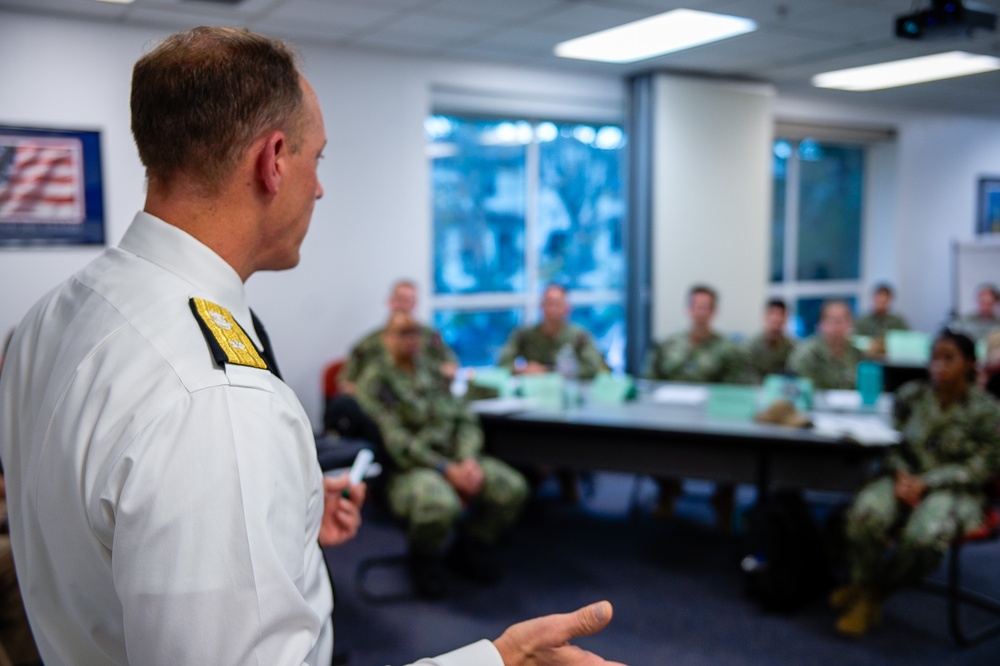 Alameda, CA (November 18, 2023) Rear Adm. Robert C. Nowakowski, Deputy Commander Naval Education and Training Command, speaks to and takes questions from Navy Reserve Center (NRC) Alameda officers during Intermediate Leader Development Course (ILDC) at NRC Alameda. NRC Alameda was established after World War II and increased activity in the wake of the attacks on 9/11. The mission of the NRC is to provide customer service and enhance the mobilization readiness training for over 600 Navy Reservists. (U.S. Navy photo by Chief Mass Communication Specialist John Pearl)