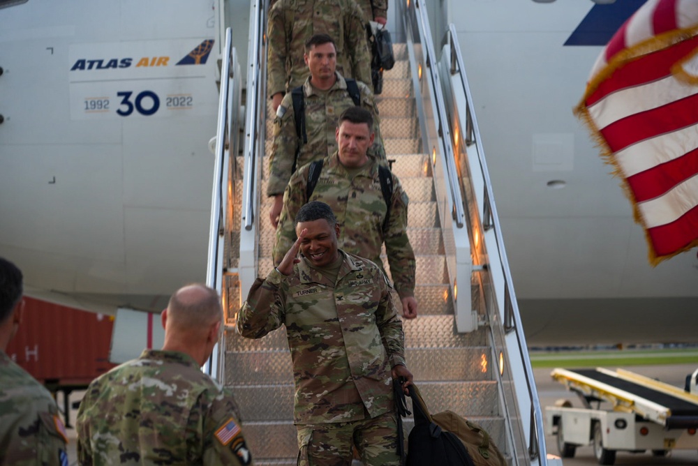 Col. Ricardo A. Turner, commander of 3rd Brigade Combat Team "Rakkasans", salutes Maj. Gen. Brett Sylvia, commanding general of the 101st Airborne Division (Air Assault) and Fort Campbell, as Soldiers touch down in Fort Campbell, Ky. on July 18, 2024. The 3rd Brigade Combat Team "Rakkasans" returned home following a nine month deployment to Eastern Europe as a part of Operation Assure, Deter and Reinforce. (U.S. Army photo by Spc. Parris Kersey)