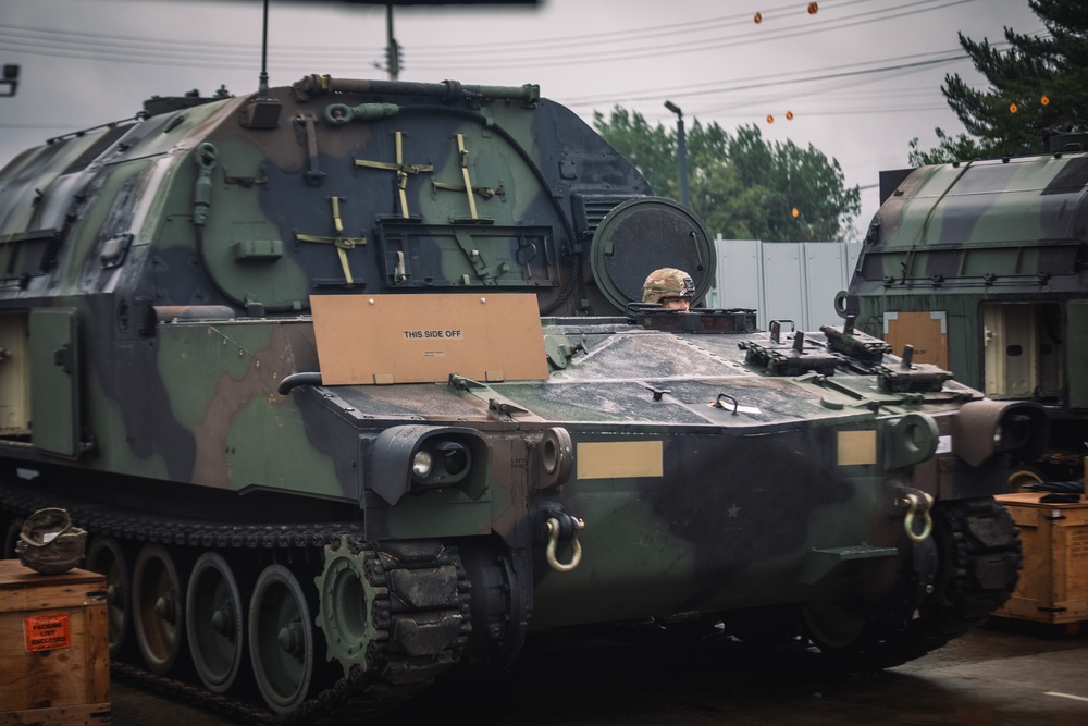 A U.S. Army Soldier assigned to 4th Battalion, 70th Armored Regiment, 1st Armored Brigade Combat Team, 1st Armored Division, carries out Preventive Maintenance Checks and Services (PMCS) on an M992A2 Artillery Ammunition Carrier at the Army Prepositioned Stocks site in support of a deployment readiness exercise at Camp Carroll, South Korea, July 27, 2024. The deployment readiness exercise is in support of Operation Pacific Fortitude, which supports long-standing agreements to the Republic of Korea by deploying forces, drawing and transporting equipment to validate unit readiness and the U.S. commitment to the alliance. (U.S. Army photo by Sgt. Eric Kestner)