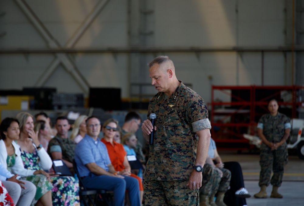 U.S. Marine Corps Maj. Gen. Marcus B. Annibale, commanding general, 1st Marine Aircraft Wing speaks during Marine Aerial Refueler Transport Squadron (VMGR) 153’s change of command ceremony at Marine Corps Air Station Kaneohe Bay, Hawaii, Aug. 9, 2024. Lt. Col. Andrew D. Myers relinquished his duties as commanding officer of VMGR-153 to Lt. Col. Paul C. Cordes. (U.S. Marine Corps photo by Cpl. Anabelle Reed-O’Brien)