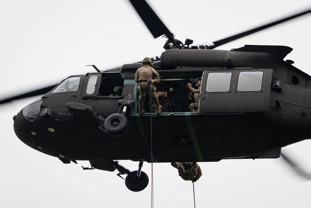 U.S. Soldiers rappel from a UH-60 Black Hawk helicopter as part of the Combined Arms Training Center (CATC) Rappel Master course at the 7th Army Training Command’s Grafenwoehr Training Area, Germany, Nov. 6, 2024. As both a TRADOC- and NATO Quality Assurance-accredited institution, CATC offers nearly 60 courses, ranging from classroom instruction on transporting hazardous materials on European public roads to combat life-saving skills in a simulated combat environment. (U.S. Army photo by Sgt. Christian Carrillo)