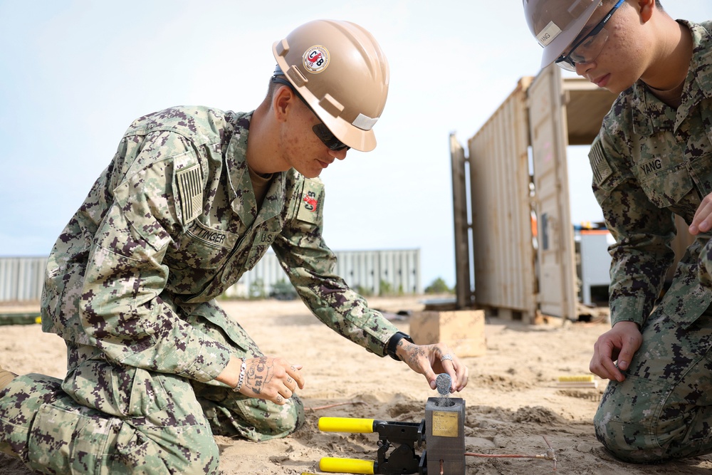 250129-N-PI330-1011 GULFPORT, Mississippi (January 29, 2025) Construction Electrician Constructionman Christopher Ottinger, left, and Construction Electrician Constructionman Niky Yang, assigned to Naval Mobile Construction Battalion 133 (NMCB 133), set a charge for exothermic welding on Naval Construction Battalion Center, Gulfport, Mississippi, January 29, 2025. NMCB 133 is conducting homeport operations as part of Navy Expeditionary Combat Command on Naval Construction Battalion Center, Gulfport during the advanced phase of the force readiness training plan (FRTP). (U.S. Navy photo by Mass Communication Specialist 1st Class Andrew Waters)