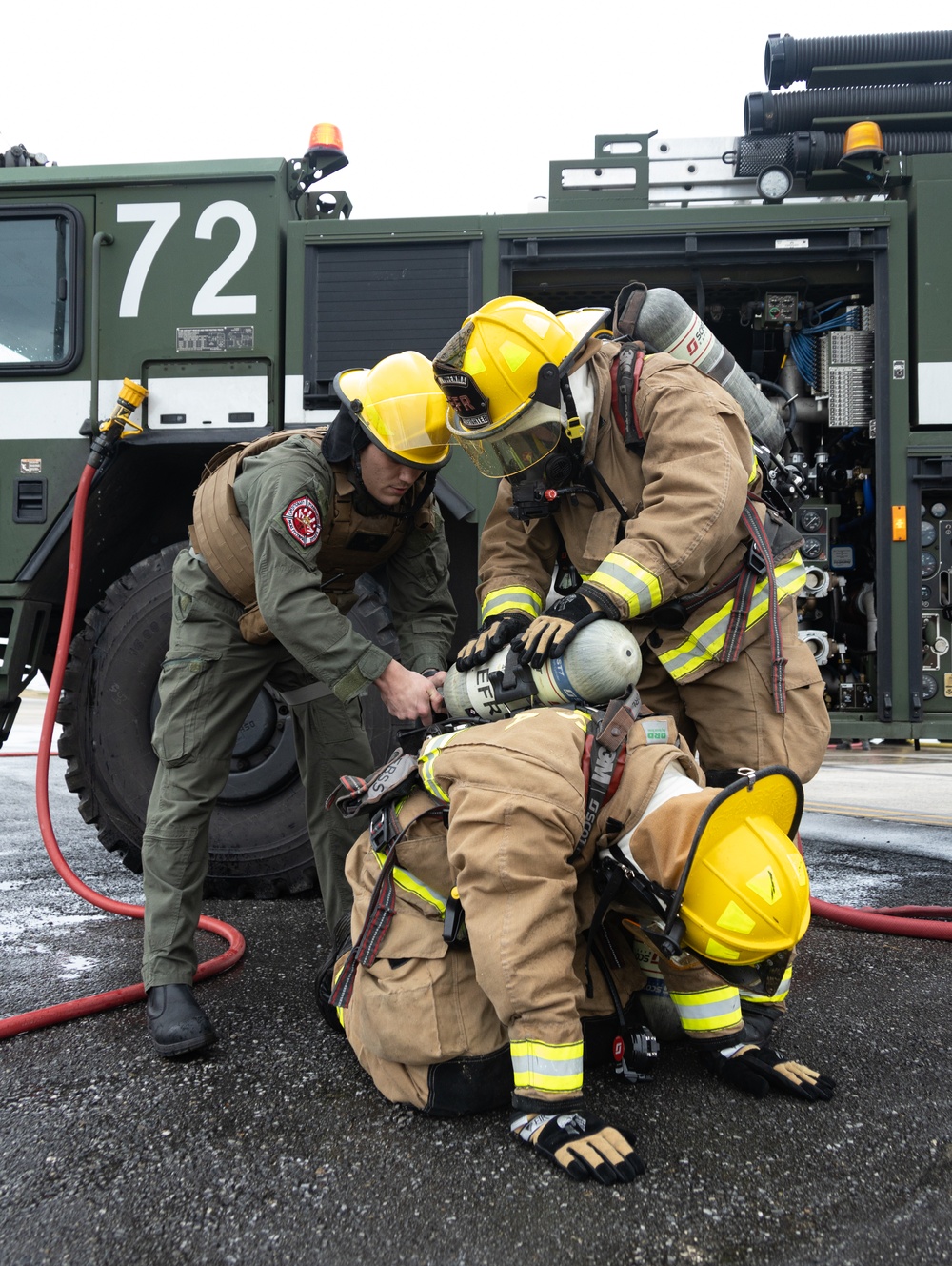 U.S. Marines with Aircraft Rescue Firefighting, Headquarters and Headquarters Support Squadron, Marine Corps Air Station Futenma, take part in exercise Resolute Response on Marine Corps Air Station Futenma, Okinawa, Japan, Feb. 26, 2025. Resolute Response is a two-week training exercise to test base defenses through the enhanced response of the MCAS Futenma Emergency Operations Center. An EOC provides a commanding officer with single point command and control of installation facilities, resources, and support functions during an emergency in order to maintain situational awareness and support timely decision-making. (U.S. Marine Corps photo by Lance Cpl. Brody Robertson)