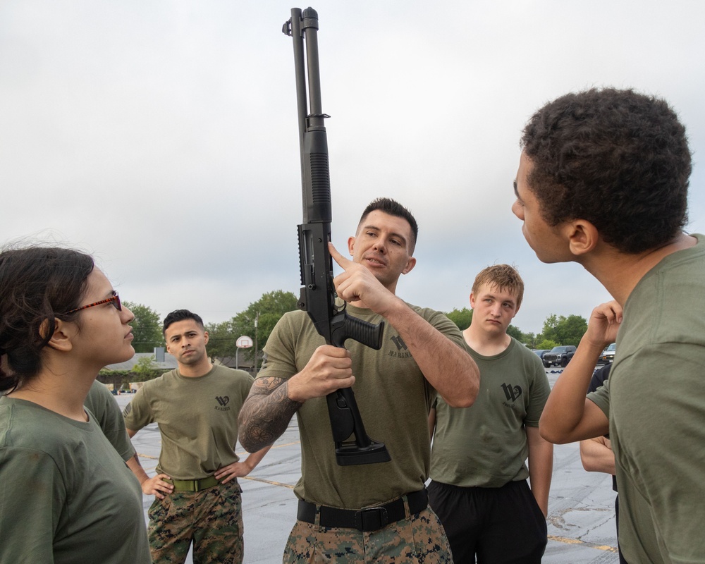 U.S. Marines Corps Staff Sgt. Rickey R. Rogers, a canvassing recruiter with Recruiting Sub-Station Waco, Recruiting Station (RS) Austin, 8th Marine Corps District, explains the characteristics of a Benelli M4 semi-automatic shotgun during RS Austin's first annual pool function at Stony Point High School, Round Rock, Texas, April 25, 2025. Annual pool functions serve as an opportunity for future Marines and family members to view and receive a firsthand experience of some of the rigors they will face in recruit training while providing an opportunity for team building and education as well as time for questions and answers. (U.S. Marine Corps photo by Cpl. Jose D. Cruz)