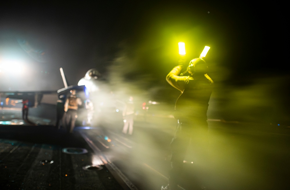 250427-N-FS097-3065 U.S. CENTRAL COMMAND AREA OF RESPONSIBILITY (April 27, 2025) A U.S. Sailor signals to an F/A-18E Super Hornet, attached to Strike Fighter Squadron (VFA) 113, on the flight deck of the Nimitz-class aircraft carrier USS Carl Vinson (CVN 70) in the U.S. Central Command area of responsibility. (Official U.S. Navy photo)