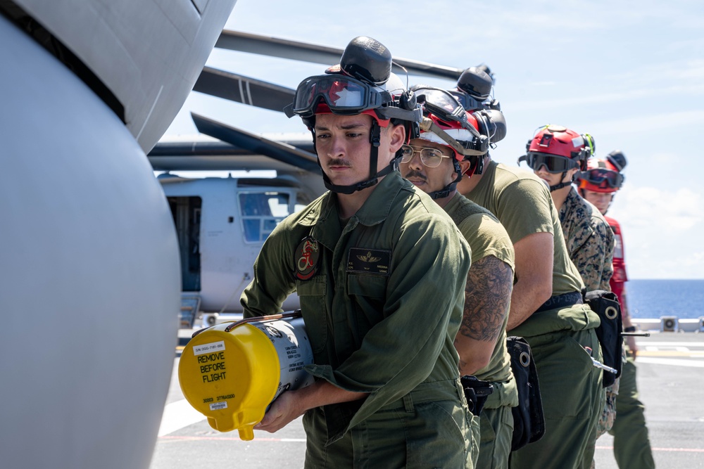 PHILIPPINE SEA (June 3, 2025) Marines, assigned to the 31st Marine Expeditionary Unit (MEU), load an AIM-120 missile on the flight deck of the forward-deployed amphibious assault ship USS America (LHA 6) while in the Philippine Sea, June 3. America, lead ship of the America Amphibious Ready Group, is operating in the U.S. 7th Fleet area of operations. U.S. 7th Fleet is the U.S. Navy’s largest forward-deployed numbered fleet, and routinely interacts and operates with allies and partners in preserving a free and open Indo-Pacific region. (U.S. Navy photo by Mass Communication Specialist 2nd Class Cole Pursley)