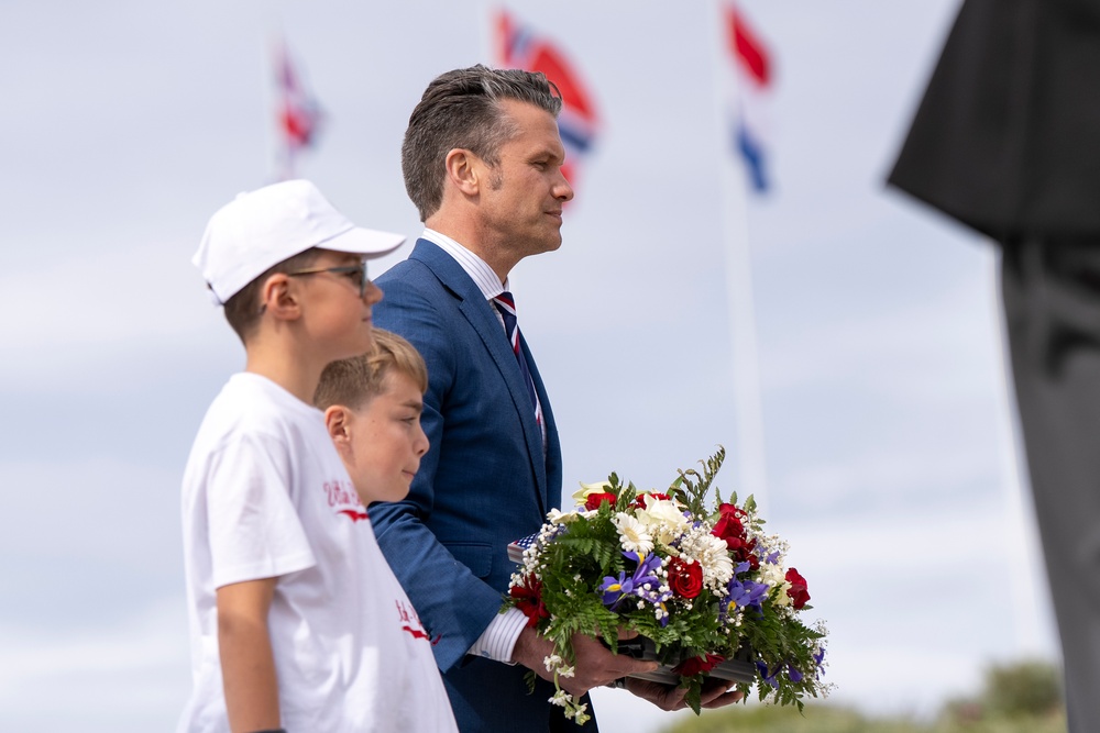 Secretary of Defense Pete Hegseth lays a wreath at the 81st Anniversary of D-Day Utah Beach Ceremony, Normandy, France, June 6, 2025. (DoD photo by U.S. Navy Petty Officer 1st Class Alexander Kubitza)