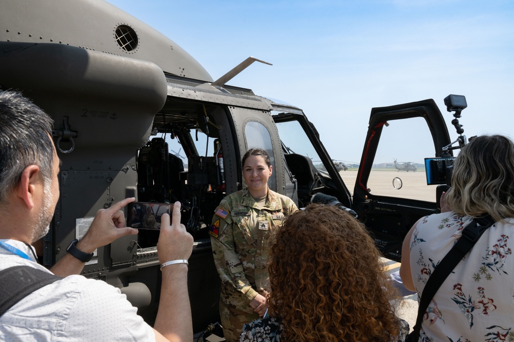 U.S. Army Sgt. Victoria Robinson, a crew chief assigned to the 82nd Airborne Division, answers questions during a media engagement at Joint Base Andrews, Md., June 12, 2025. Robinson provided an overview of the UH-60 Black Hawk helicopter to news anchors and other media personnel ahead of the Army’s 250th Birthday celebration. (U.S. Air Force photo by Airman 1st Class Patrick Njuguna)