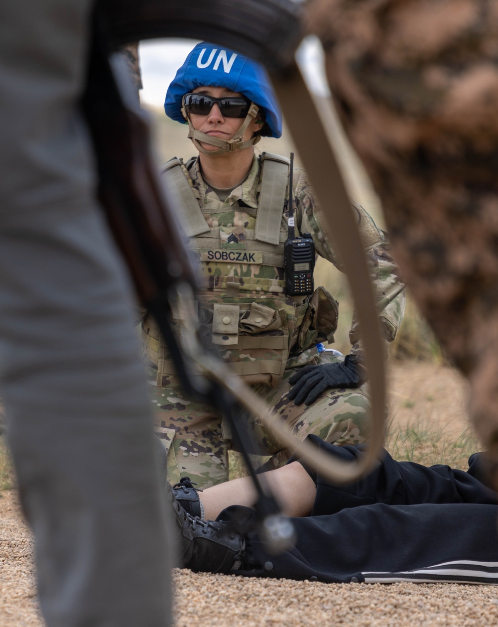 U.S. Army Sgt. Kimberly Sobczak, a military police officer assigned to the 390th Military Police Battalion, 11th Military Police Brigade, 200th Military Police Command assists Mongolian Armed Forces 1st Lt. Erdenzaya Sergelen, a communication officer assigned to Unit 321, playing as a simulated civilian casualty, during a simulated U.N. convoy mission, during Khaan Quest, on June 17, 2025, at Five Hills Training Area, Mongolia. U.S. Army Soldiers were provided small arms by the Mongolian Armed Forces to facilitate U.N. training. Khaan Quest is an annual, multinational and multicomponent training exercise led by the Mongolian Armed Forces designed to promote regional peace and security. (U.S. Army photo by Staff Sgt. Tristan Moore)