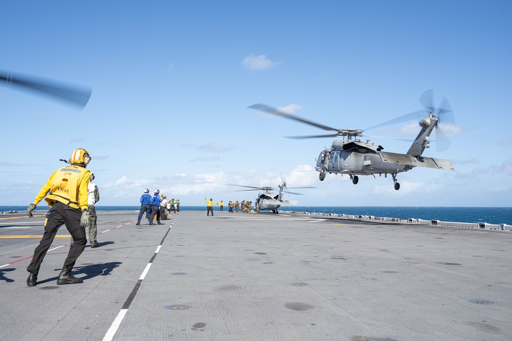 250620-N-FC892-2259 TASMAN SEA (June 20, 2025) An MH-60S Seahawk from Helicopter Sea Combat Squadron (HSC) 25 takes off of the flight deck of the forward-deployed amphibious assault ship USS America (LHA 6) while conducting flight operations in the Tasman Sea, June 20. America, lead ship of the America Amphibious Ready Group, is operating in the U.S. 7th Fleet area of operations. U.S. 7th Fleet is the U.S. Navy’s largest forward-deployed numbered fleet, and routinely interacts and operates with allies and partners in preserving a free and open Indo-Pacific region. (U.S. Navy photo by Mass Communication Specialist 2nd Class Cole Pursley)