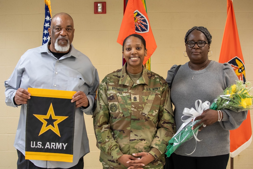 Incoming 7th Signal Command (Theater) HHC First Sgt. Candice Bromell, with her parents after the Change of Responsibility ceremony, March 21, 2025.