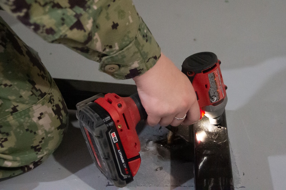 Air-Traffic Controller Airman Apprentice Kadence Rowatt, from Parachute, Colorado, builds racks in a berthing aboard USS Ronald Reagan (CVN 76), while in port Naval Base Kitsap in Bremerton, Washington, Sept. 24, 2025. The Nimitz-class aircraft carrier USS Ronald Reagan is undergoing scheduled maintenance at Puget Sound Naval Shipyard and Intermediate Maintenance Facility while remaining a combat-ready force dedicated to protecting and defending the United States. (U.S. Navy photo by Mass Communication Specialist Seaman Hunter Boyd)