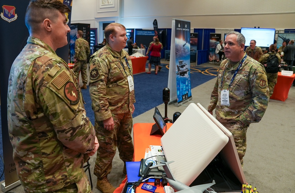 Col. Nathan Stuckey, AFWERX director, gets briefed by Staff Sgt. Reilly Klinder, left, and Senior Airman Chase Meecha, AFWERX Spark, during the Air, Space and Cyber Conference at the Gaylord National Resort and Convention Center in National Harbor, Maryland, on Sept. 24, 2025. Spark Street showcases how Airmen and Guardians are solving operational challenges through grassroots innovation, connecting them with senior leaders and industry partners. This collaborative event accelerates the delivery of mission-critical capabilities aligned with national defense priorities. (U.S. Air Force video by Matthew Clouse)