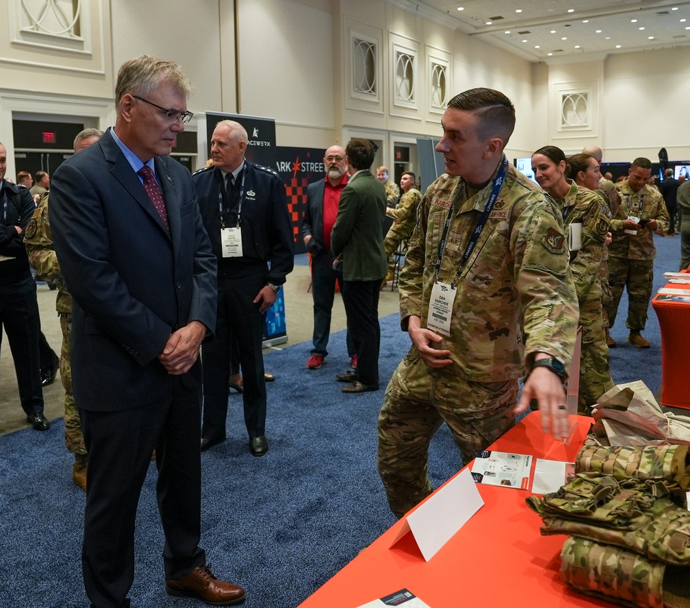 Staff Sgt. Dan Karcher, AFWERX Spark, briefs Dr. Troy Meink, Secretary of the Air Force, during the Air, Space and Cyber Conference at the Gaylord National Resort and Convention Center in National Harbor, Maryland, on Sept. 24, 2025. Spark Street showcases how Airmen and Guardians are solving operational challenges through grassroots innovation, connecting them with senior leaders and industry partners. This collaborative event accelerates the delivery of mission-critical capabilities aligned with national defense priorities. (U.S. Air Force video by Matthew Clouse)