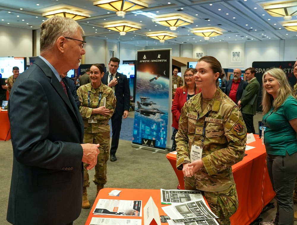 Senior Airman Erika Gustafson, AFWERX Spark, briefs Dr. Troy Meink, Secretary of the Air Force, during the Air, Space and Cyber Conference at the Gaylord National Resort and Convention Center in National Harbor, Maryland, on Sept. 24, 2025. Spark Street showcases how Airmen and Guardians are solving operational challenges through grassroots innovation, connecting them with senior leaders and industry partners. This collaborative event accelerates the delivery of mission-critical capabilities aligned with national defense priorities. (U.S. Air Force video by Matthew Clouse)